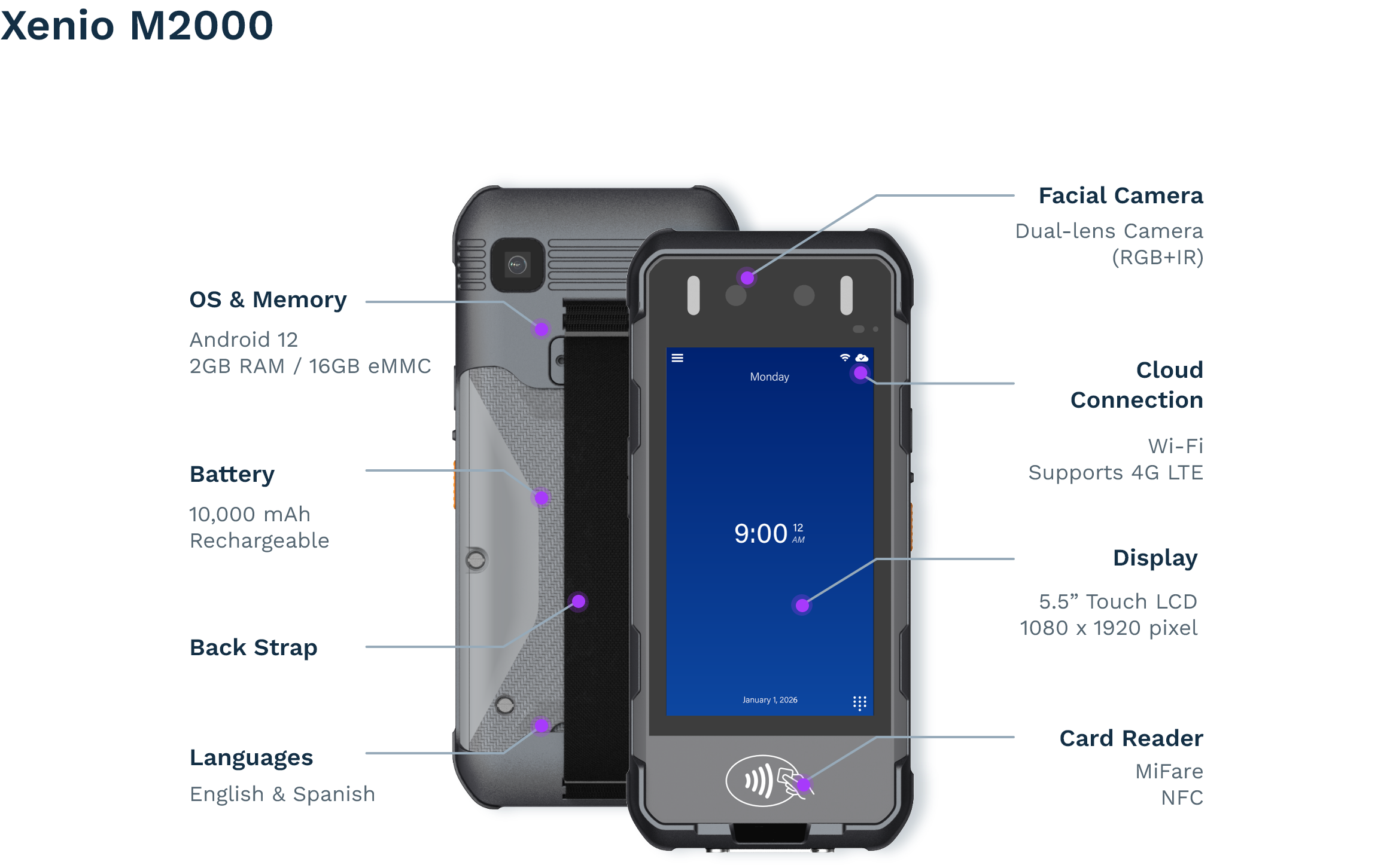 The Xenio M2000 features a high-capacity internal battery designed to support full shifts without relying on permanent power sources.